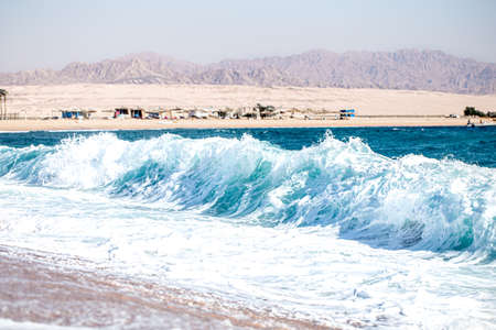 coast of the red sea with the Sinai mountains in Egypt. Red sea Sinai mountains sea panoramic landscape Sharm El Sheikh in Egypt. Coastline landscape of Red Sea in Gulf of Aqaba