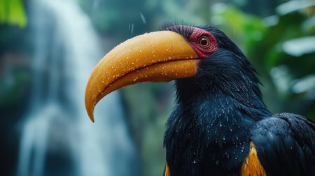 A close-up of a Wreathed hornbill's vibrant red-orange beak and intricate casque, set against a backdrop of blurred waterfalls and rainforest greenery.