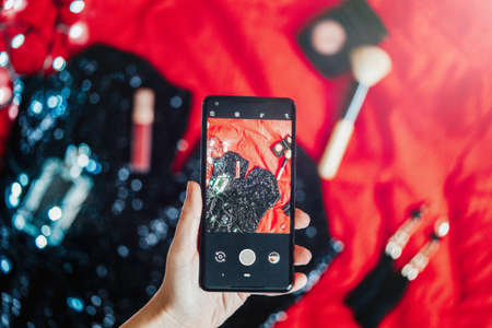 Close up of hand holding mobile phone making photos of cocktail dress.