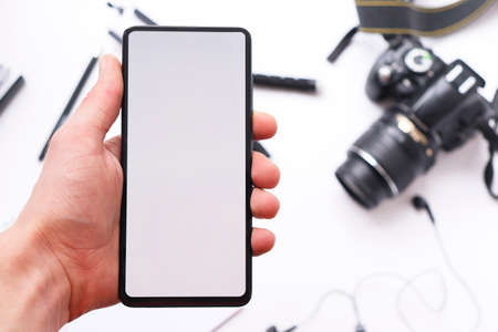 Photo camera in the hands of a man professional equipment hobby Creative approach studio cropped view