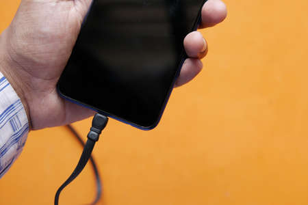 charging smart phone with a cable on color background .