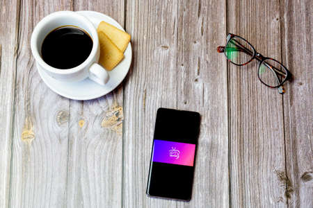 03-22-2021 Portsmouth, Hampshire, UK A mobile phone or cell phone laid on a wooden table with the IPTV app open on screen