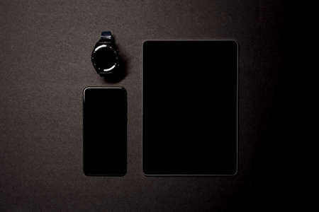 Overhead shot of a smartwatch, smartphone and a tablet on a black background. Wireless technology concept. Horizontal photography. Copyspace