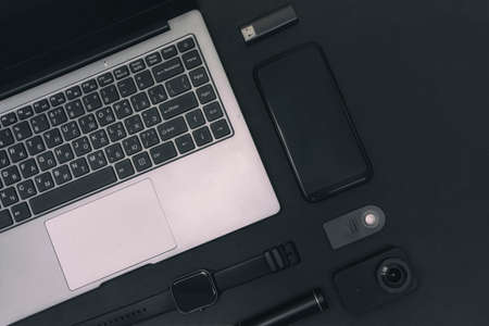 Set of multimedia devices. Laptop with an action camera, a smartphone, a smart watch and a power bank with USB flash drive on a black background