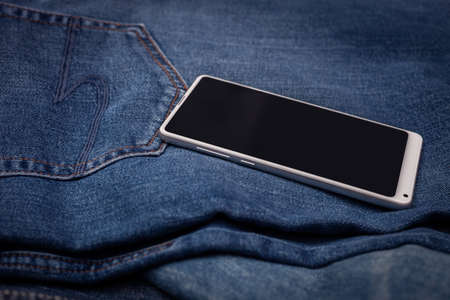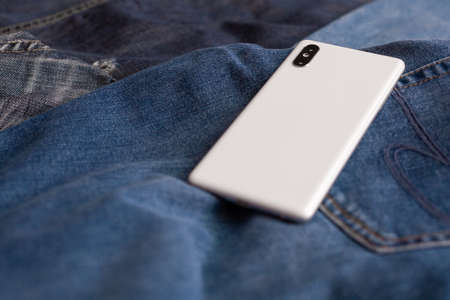 white mobile phone on blue jeans