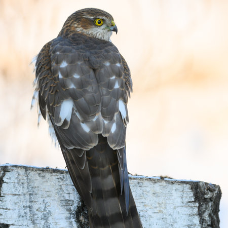 Eurasian sparrowhawk Accipiter nisus, known as the northern sparrowhawk, sitting on a birch stump. Sparrowhawk in winter.