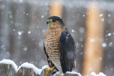 A Sharp-shinned Hawk Accipiter striatus looks out from its perch while taking shelter from a snow storm