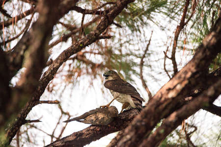 Juvenile light morph Red-tailed hawk Buteo jamaicensis eats a blue jay in a pine tree in Naples, Florida