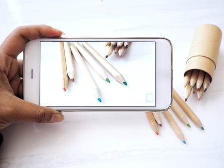 Close-up female hand using smartphone taking a cup of coffee for Post upload file to online on Internet .