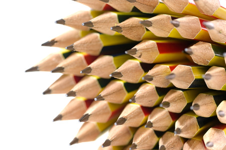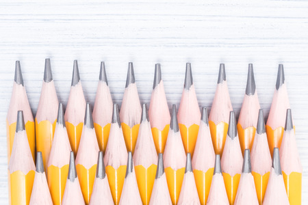 A bunch of wooden pencils aligned in an ascending order on white background, shot from above.