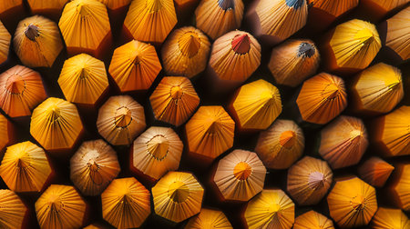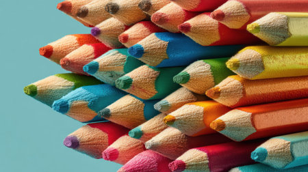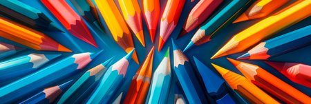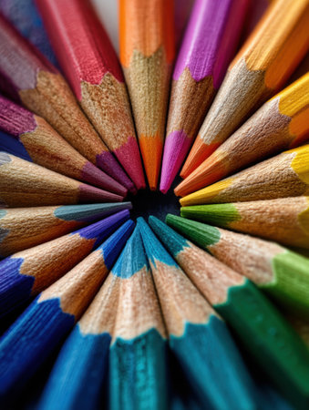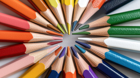 Colorful pencil tips form an intricate radial arrangement, highlighting a variety of vibrant shades and textures, creating a visually striking display.