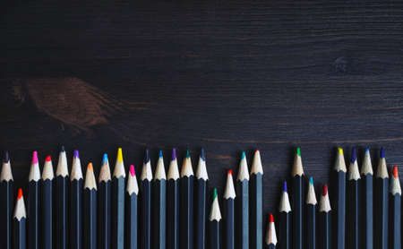 Multicolored pencils collection on wooden background. Row of colored pencils. Top view. Flat lay.