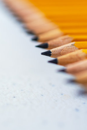 A diagonal row of penciils sit on a neutral table. Focus on one pencil. Copy space.