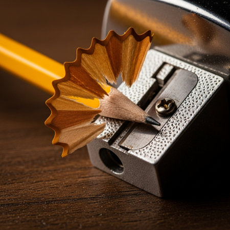 A detailed close-up of a sharpened pencil in the act of being sharpened, highlighting the flying shavings and dust against a dark background, showcasing the beauty of the sharpening process.