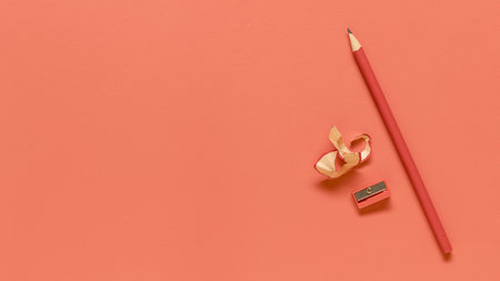 Pink pencil with a colorful sharpener and curled shavings on a bright yellow background. Ideal for education, creativity, and school-themed visuals.