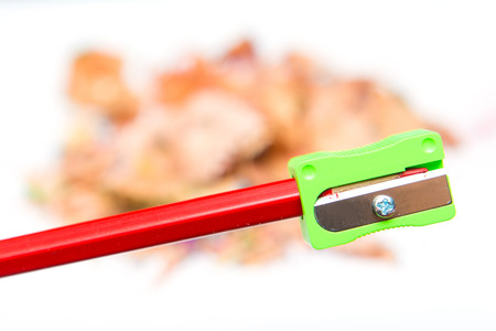Sharpener and red pencil with wood shavings