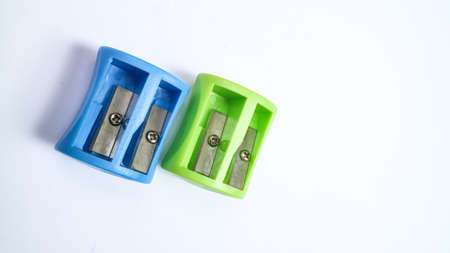 Blue and green pencil sharpeners against white background. suitable for your education design content
