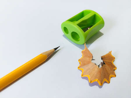 Pencil, metal sharpener and pencil shavings on white background. Horizontal image.