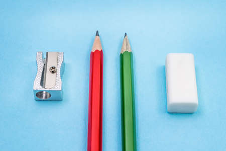 Two pencils, sharpener and eraser on blue background. Top view. School concept