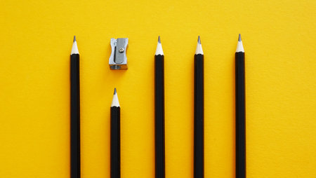 Pencils and pencil sharpeners. Top view. Flat lay. Copy space. Creativity. Drawing tools.