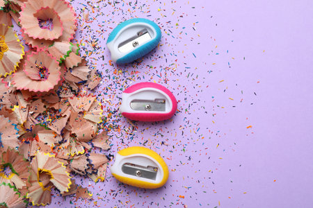 Pencil shavings and sharpeners on violet background, flat lay. Space for text