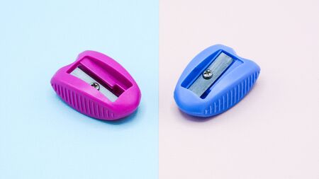 pink and blue plastic pencil sharpener on pink and blue background