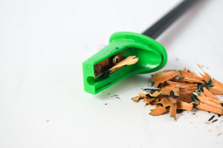 green pencil sharpener and dark green pencils, pencil shavings on white background