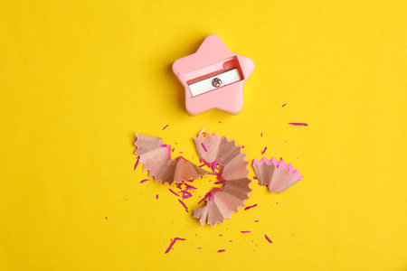 Sharpener and pencil shavings on a yellow background