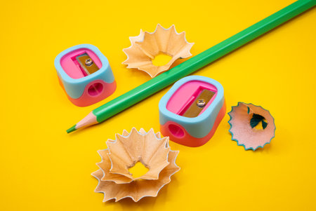 Green pencil surrounded by curled shavings and a dual-tone sharpener on a yellow background. Great for school and creative themes.