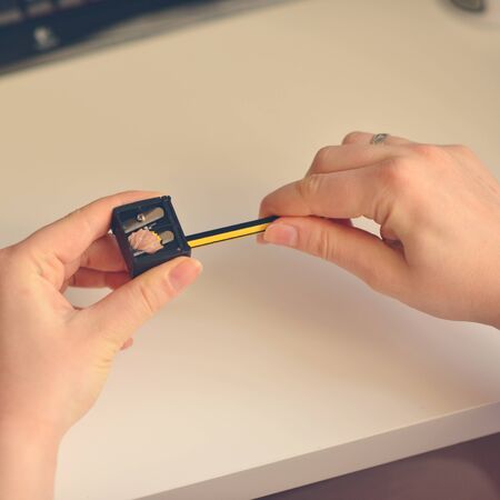 close-up. Action of sharpening a pencil with a standard sharpener.