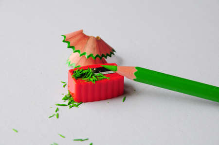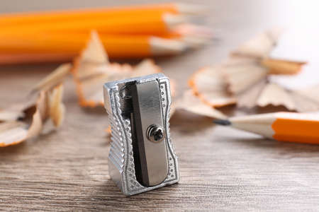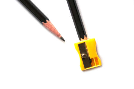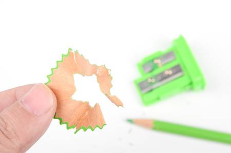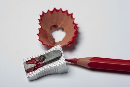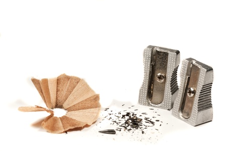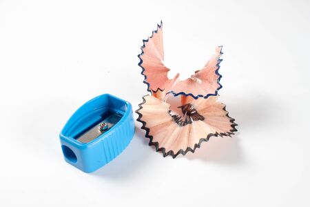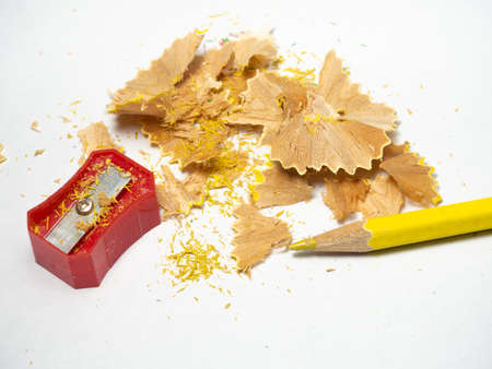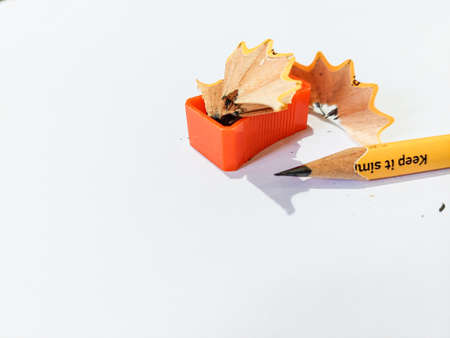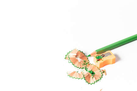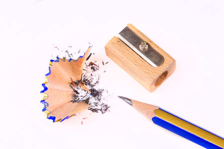 Pencil, metal sharpener and pencil shavings on white background. Horizontal image.