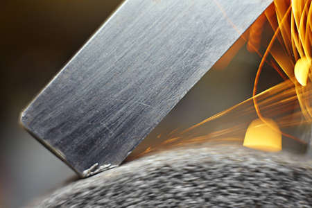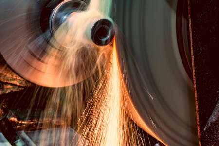 metalworking industry: finishing metal working on horizontal surface grinder machine with flying sparks