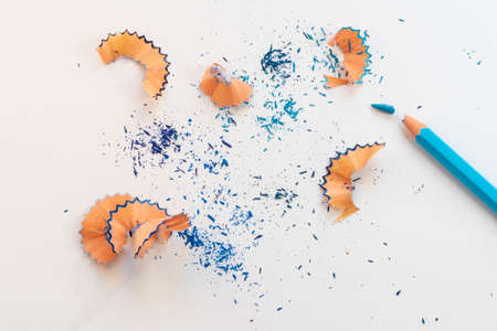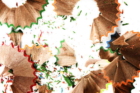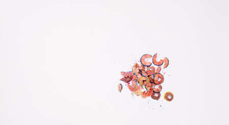 Sawdust from a sharpened colored pencils on the white background. top view. copyspace. Banner. art concept. Drawing hobby. template. mockup design. isolated object. Curly wooden trash. messy texture.