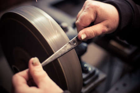 Man's hands are sharpening a small knife on a grindstone. The process of manual grinding of a cutting tool. Middle-aged man of European race. Hand tool