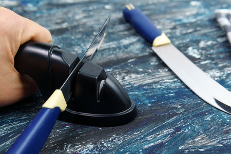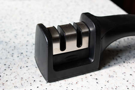 man is sharpening kitchen knives. sharpening a knife with a home sharpener