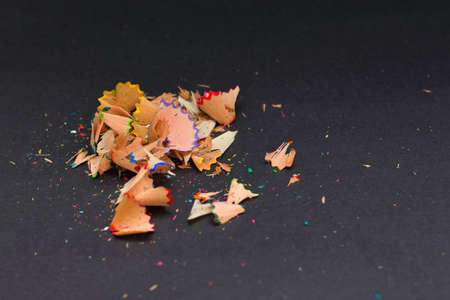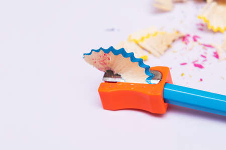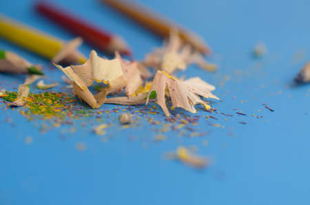 Artist's workshop. School supplies. Pencil sharpening. Multicolored pencils. Wood and graphite shavings. The process of preparing for work. Creative mess