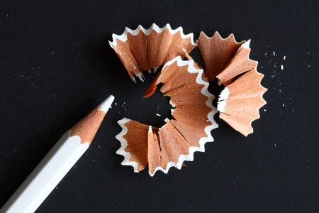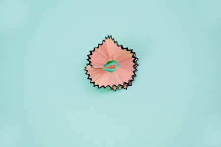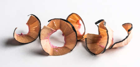 Closeup macro detail of pencil sharpener wooden swirl shavings on white