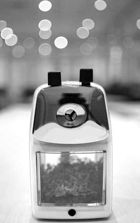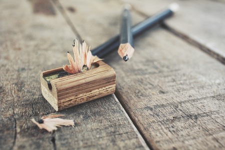 macro photograph of metallic pencil sharpener, under rustic wooden table, with space for text