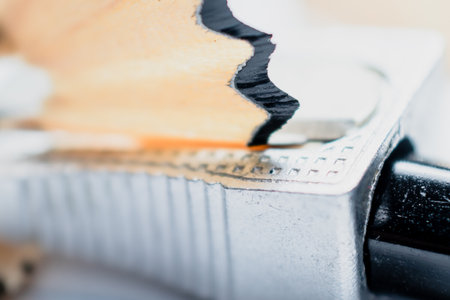 A detailed close-up of a sharpened pencil in the act of being sharpened, highlighting the flying shavings and dust against a dark background, showcasing the beauty of the sharpening process.