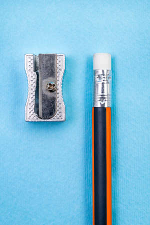 Pencil with metal pencil sharpener on blue background. Stationery. Office tool. Back to school. Space for text. Education.