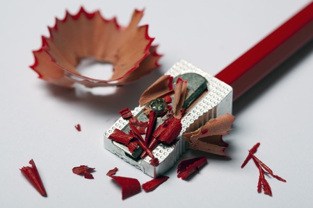 Shavings of red pencil in close-up on a white background. Pencil lead whole and broken on a white background. Leftovers from a pencil. Macro, a pile of shavings