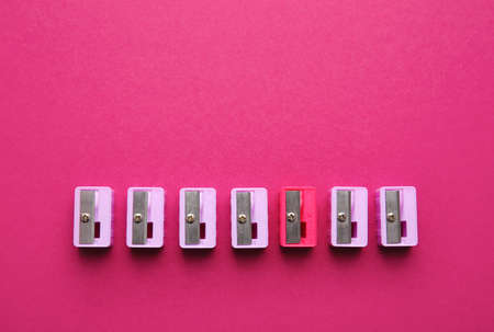 Pink sharpener among lilac ones on color background. Concept of uniqueness