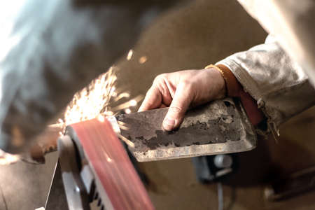 Blade sharpening creating on a belt grinder process. Knife making master hands close up.
