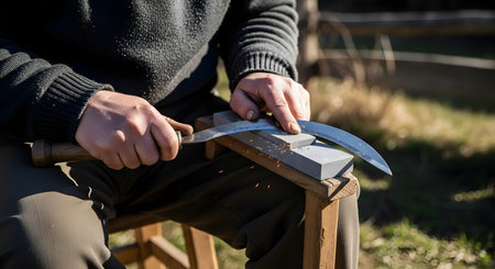Close-up of a person's hands sharpening a curved metal sickle blade on a whetstone outdoors. The image depicts traditional tool maintenance, rural craftsmanship, and preparation for agricultural work.