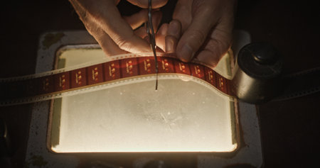Hands expertly handle a film reel in a dim space, highlighting artistry and craftsmanship