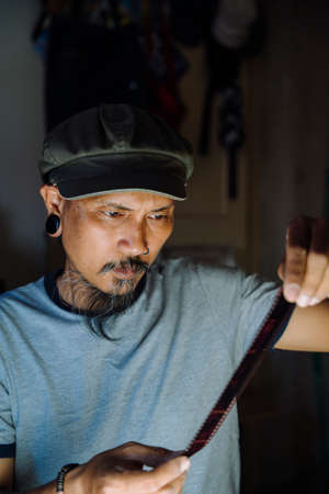 Close up view and low light. Copy space a man wearing glasses he smiled. Photographic film unfold then see photos taken in the past.