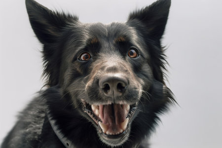 Portrait of a black dog with open mouth on a gray background. generative ai