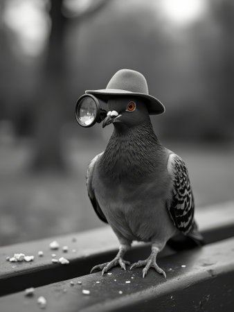 Pigeon in a bowler hat wearing monocle perched on park bench in black and white.