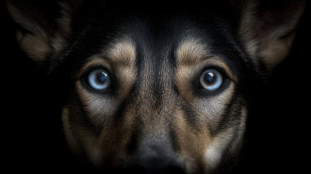 This captivating close-up image showcases a dog's face with striking blue eyes, illuminated against a dark background, revealing deep emotions and character.
