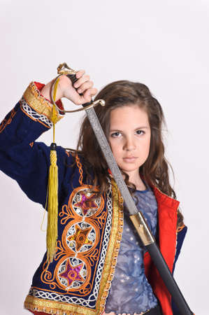 Ukrainian cossack posing with long sword isolated on black and smoked background